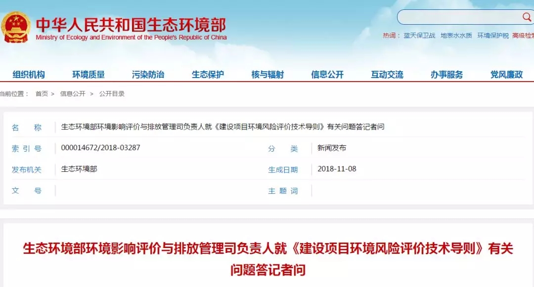 生態(tài)環(huán)境部日前印發(fā)了《建設(shè)項(xiàng)目環(huán)境風(fēng)險(xiǎn)評(píng)價(jià)技術(shù)導(dǎo)則》(HJ169-2018)(以下簡(jiǎn)稱《風(fēng)險(xiǎn)導(dǎo)則》),生態(tài)環(huán)境部環(huán)境影響評(píng)價(jià)與排放管理司負(fù)責(zé)人就《風(fēng)險(xiǎn)導(dǎo)則》修訂的背景、思路及內(nèi)容等有關(guān)問題回答了記者的提問。